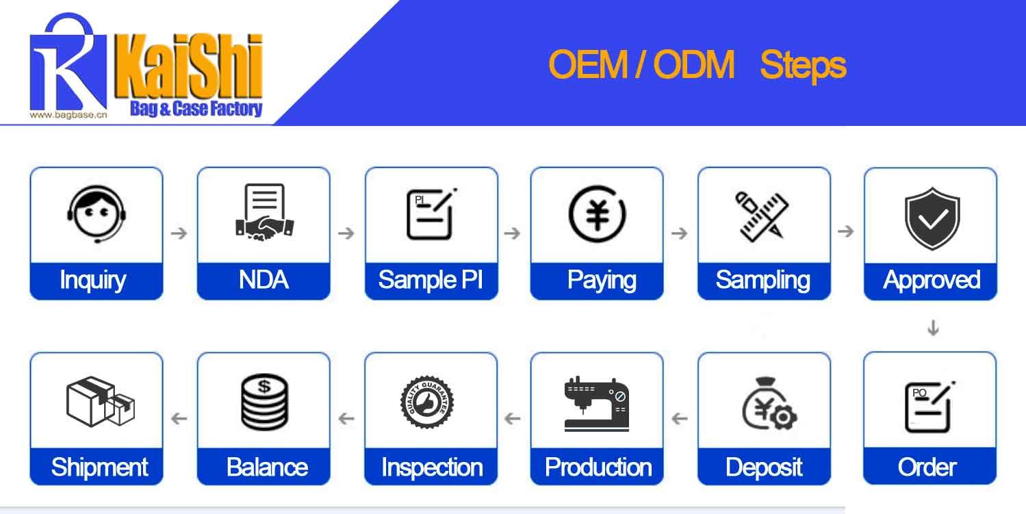 We can produce the bags according to your own design, sample, pictures, even ideas. Now, here is the customized order steps for you from Kaishi Bag Factory.