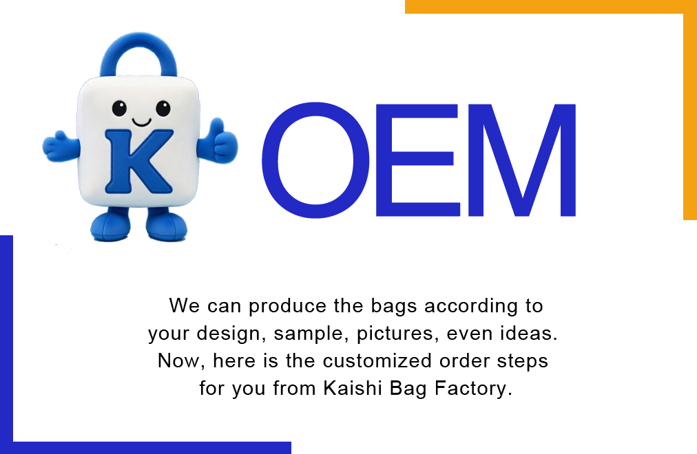 We can produce the bags according to your own design, sample, pictures, even ideas. Now, here is the customized order steps for you from Kaishi Bag Factory.
