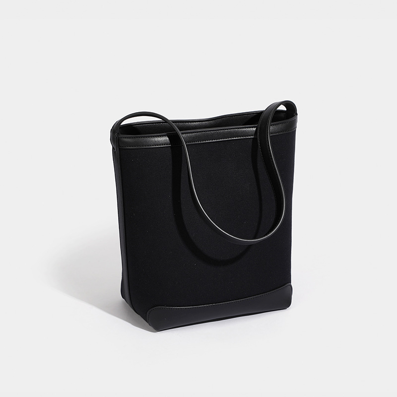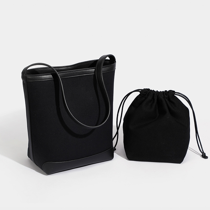 Stylish canvas bucket tote/shoulder bag with drawstring closure, contrast PU leather trim & long adjustable strap. Large capacity, casual-modern chic. Colors: beige + black (main), black + black, khaki + brown. Ready stock wholesale, custom logo/OEM supported from China factory. Perfect for everyday fashion brands, travel, beach, shopping, and versatile relaxed luxury carry.