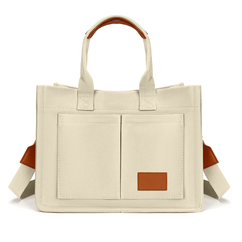 This canvas multi-pocket tote bag is ideal for fashion retailers, online brands, mom gifting, travel lines, or seasonal private label collections. The organized pockets, contrast trim, large capacity, and multi-way carry make it a bestseller in the competitive practical everyday tote market.