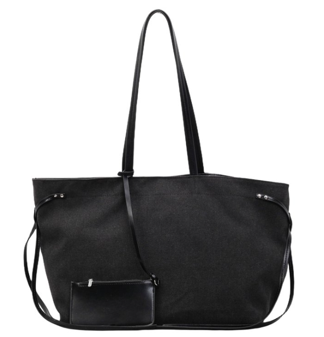 Available in timeless neutral tones—classic black (main) and versatile khaki/beige—this tote combines rugged canvas texture with refined leather details, aligning with 2026's trends in oversized totes, mixed-material accents, detachable pouches, and practical large-capacity bags that prioritize durability, organization, and effortless style.