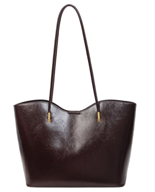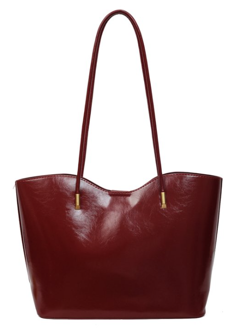 Available in rich, polished tones—deep burgundy (main), sleek black, warm brown, and soft caramel—this tote offers ample space with refined elegance, aligning with 2026's trends in glossy textures, minimalist silhouettes, gold hardware details, and large-capacity totes that prioritize quality, versatility, and quiet luxury.