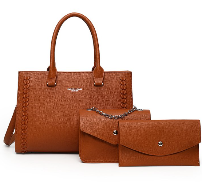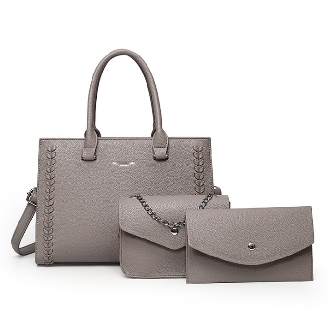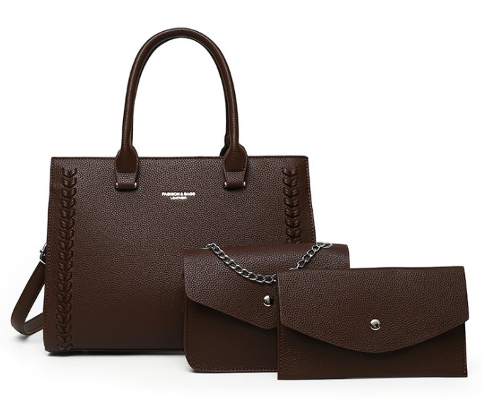 Elevate everyday elegance with this refined 3-piece PU leather set, featuring a structured tote bag accented with intricate braided side detailing for a sophisticated touch. Crafted from premium pebbled PU leather, the set includes a matching long wallet and compact card holder, with gold-tone hardware and a chain-strap clutch option—ideal for modern women, fashion boutiques, retail brands, or private label collections seeking coordinated luxury with subtle craftsmanship.
