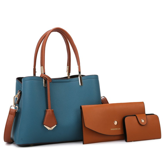 Achieve polished coordination with this refined 3-piece PU leather set, centered around a structured tote bag with matching long wallet and compact card holder. Crafted from premium pebbled PU leather, the set features a clean rectangular silhouette, gold-tone hardware accents, and a signature metal tag detail—ideal for modern professionals, fashion boutiques, retail brands, or private label collections seeking timeless, matching luxury accessories.