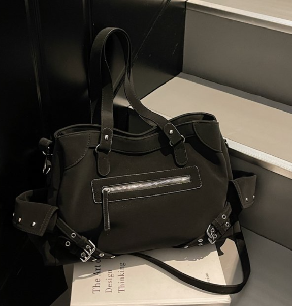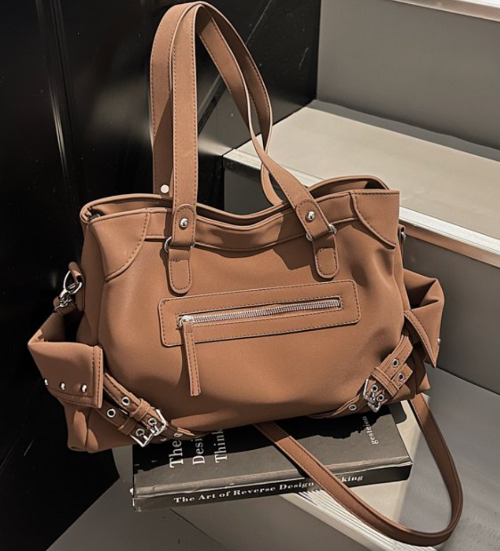 - Strap & Handle — Long, fixed shoulder strap for comfortable carry; wide top opening for easy access; decorative belt straps add style and structure