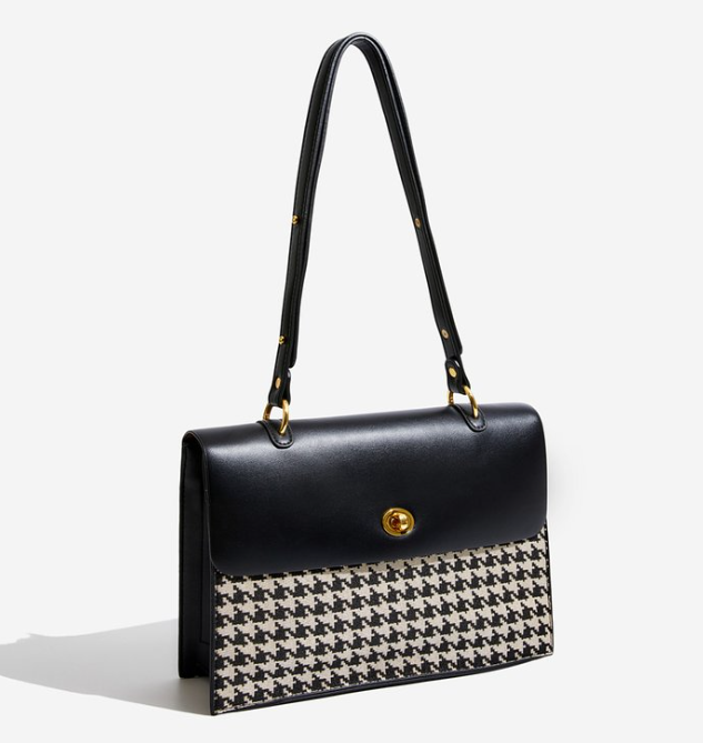 Available in refined colorways—rich brown with contrast edges, sleek black with houndstooth print base, and classic black & white houndstooth—this bag combines a structured shape with the trendy chain strap and gold hardware, aligning with 2026's focus on contrast design and elevated everyday luxury in handbags.