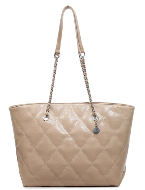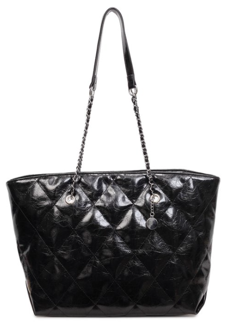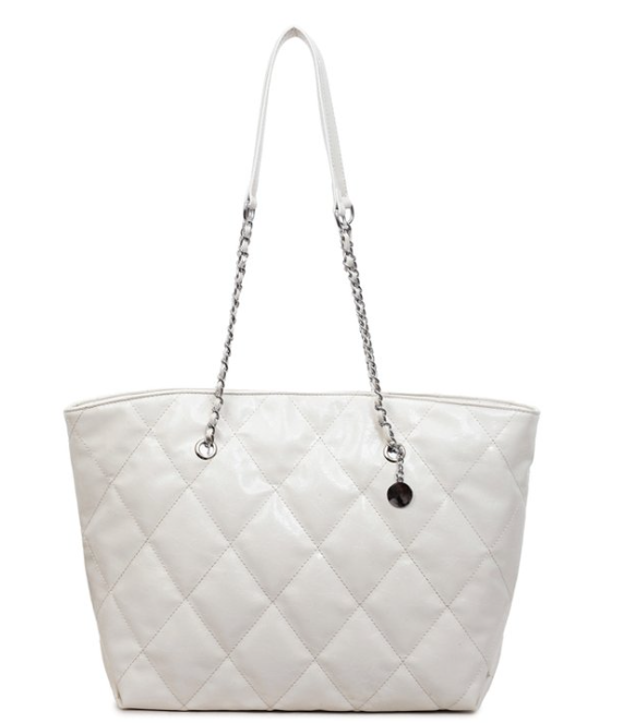 Elevate everyday elegance with this quilted PU leather chain tote shoulder bag, featuring timeless diamond quilting across the body, a luxurious chain strap with leather accents, and a signature pendant charm for subtle sophistication. The structured yet spacious open-top silhouette, wide top handles, and generous interior provide both style and practicality—ideal for work, shopping, travel, or as a versatile signature piece for fashion boutiques, retail brands, or private label collections seeking classic, coordinated luxury.