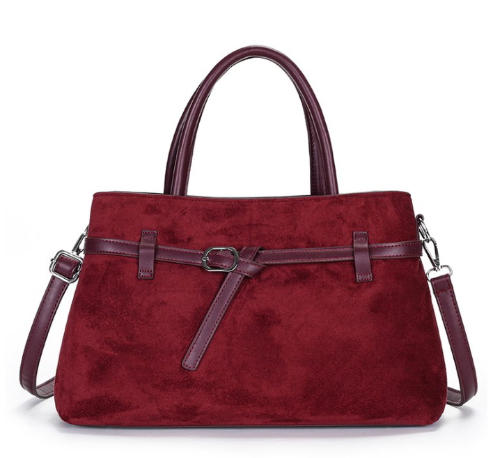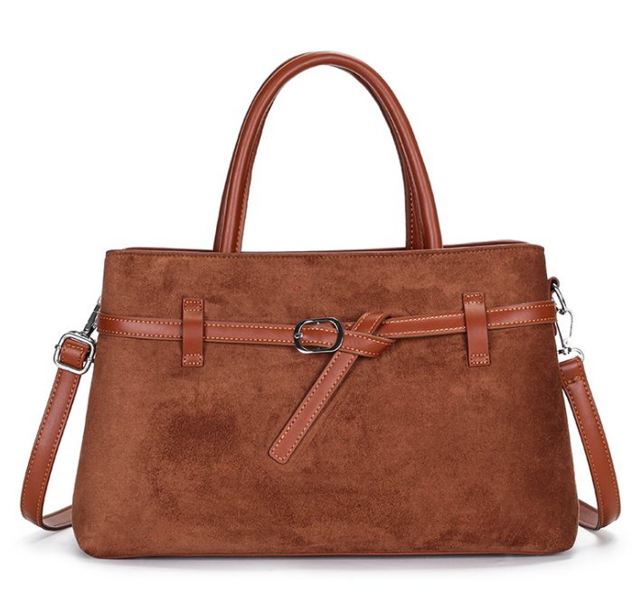 Elegant structured tote bag in suede with PU trim & classic belt buckle detail, double handles & adjustable strap. Colors: brown (main), black, burgundy. Ready stock wholesale, custom logo/OEM supported from China factory. Perfect for timeless fashion brands and sophisticated daily carry.