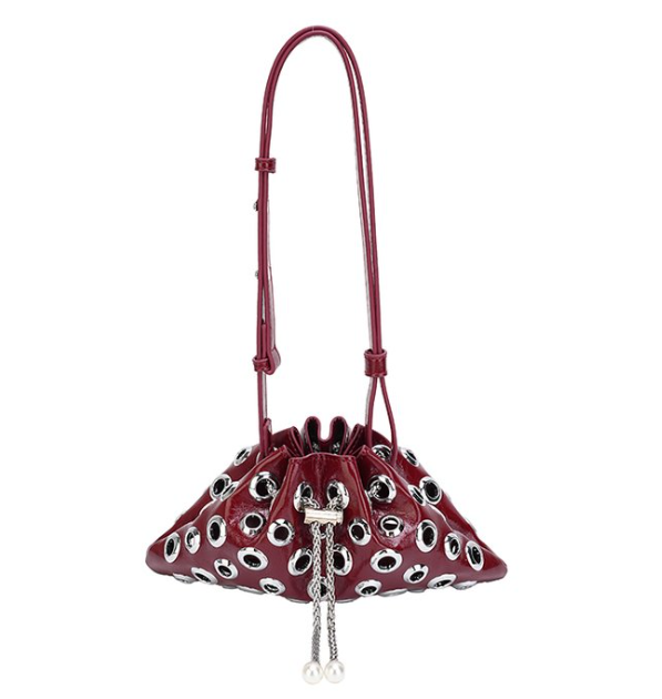 Custom PU Leather Mini Drawstring Shoulder Bag – Metallic Grommet Crossbody with Pearl Chain